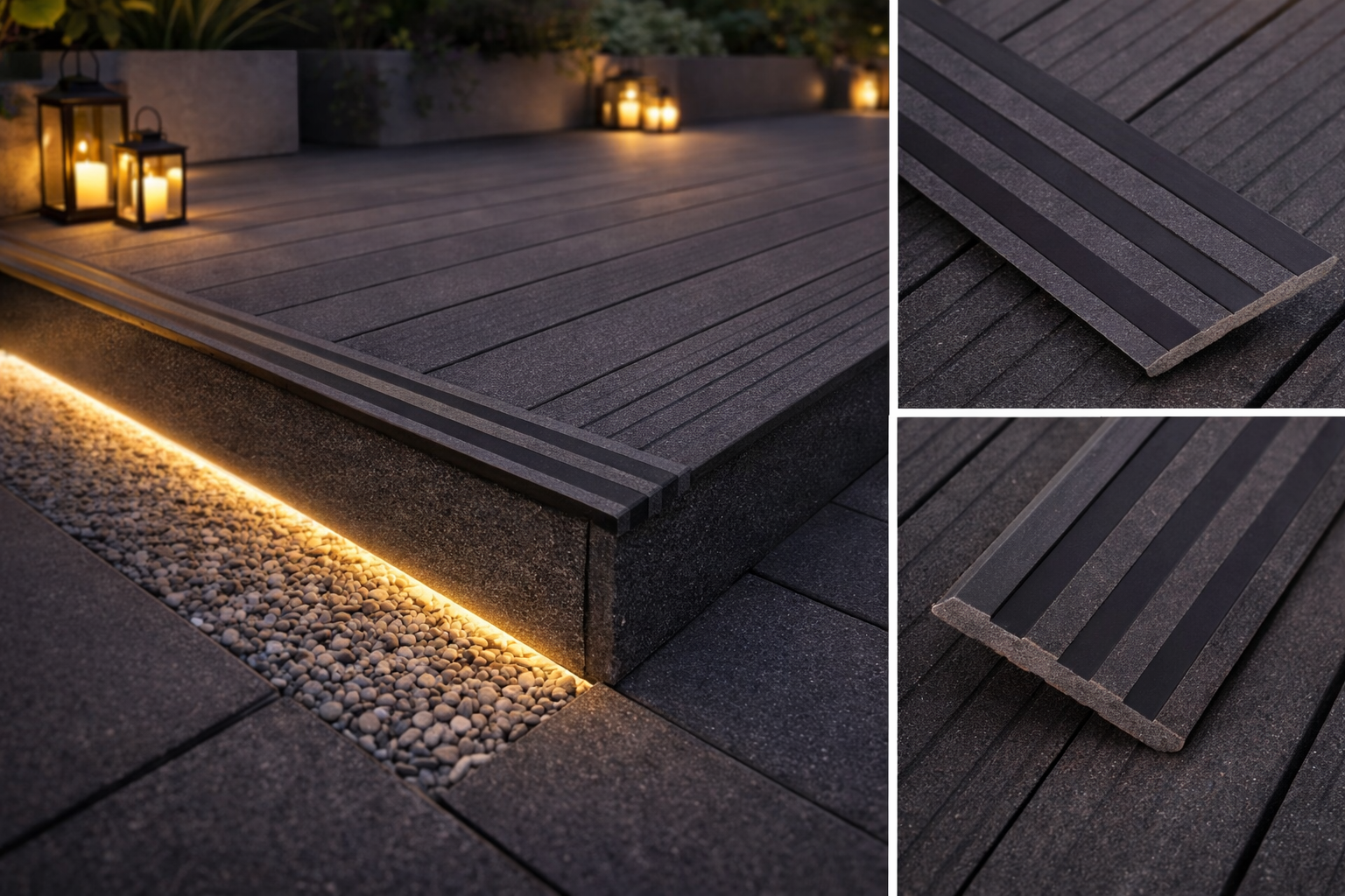 Listwa maskująca w kolorze Antracyt to element wykończeniowy przeznaczony do estetycznego i trwałego zamknięcia krawędzi tarasu wykonanego z desek kompozytowych ProDeck.