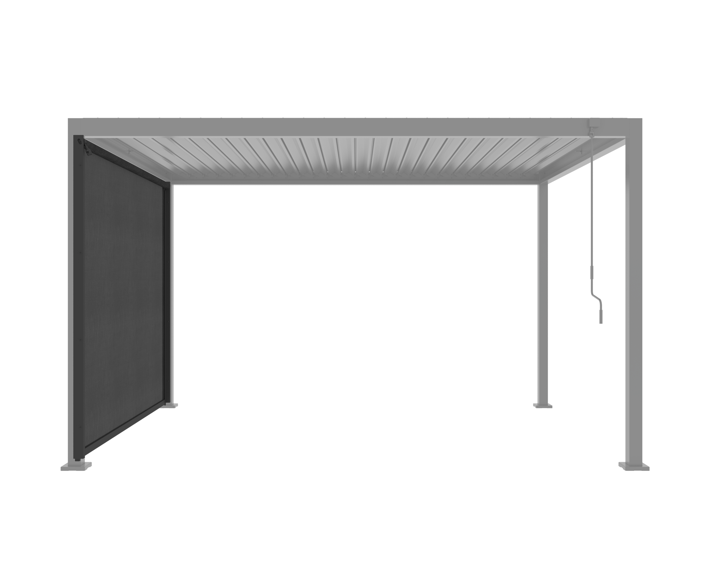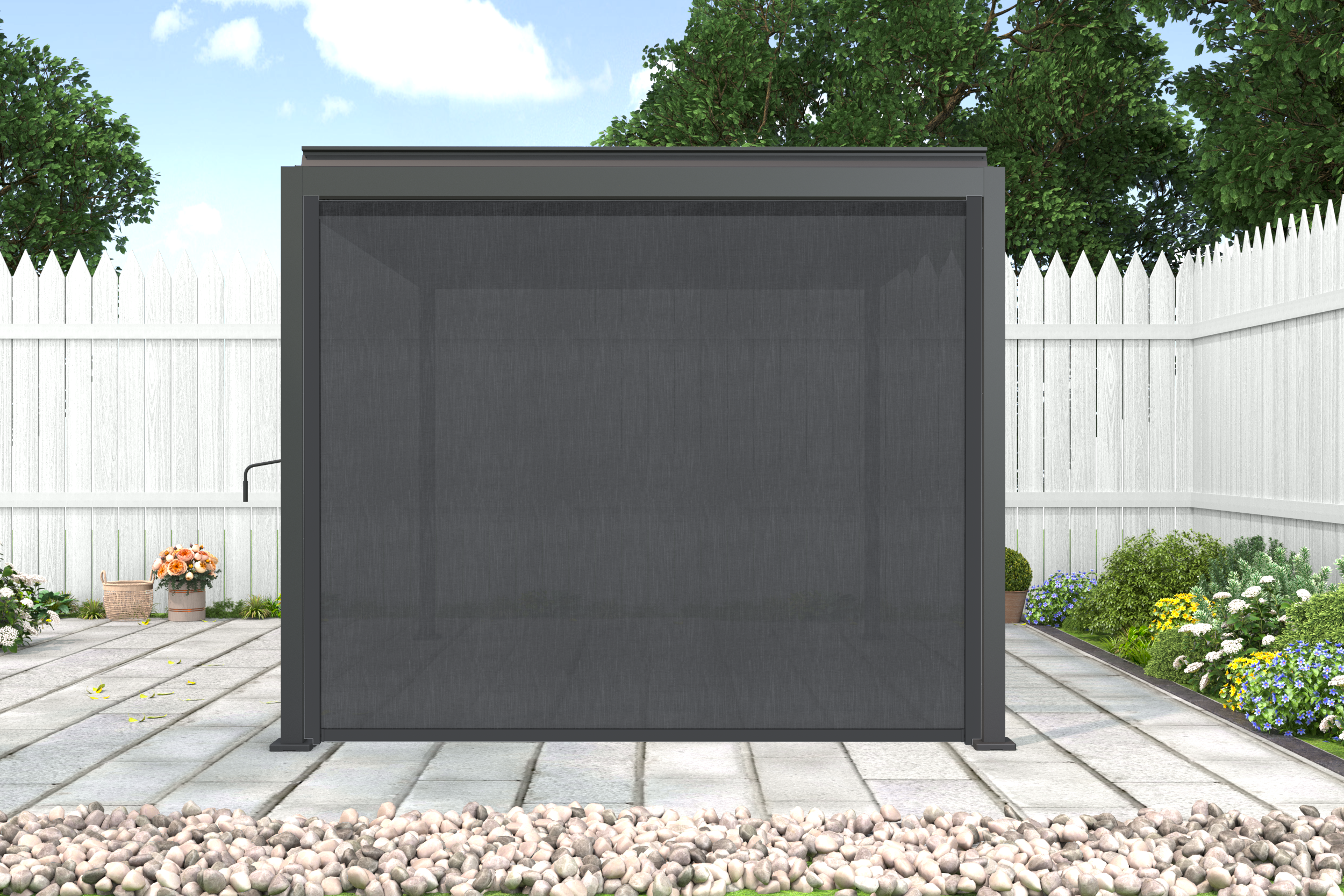 Roleta jest dopasowana do pergoli NORDVIC SOLA w wariancie z bokiem 3 m, dzięki czemu tworzy z całością spójny wizualnie i praktyczny system zabudowy tarasu.