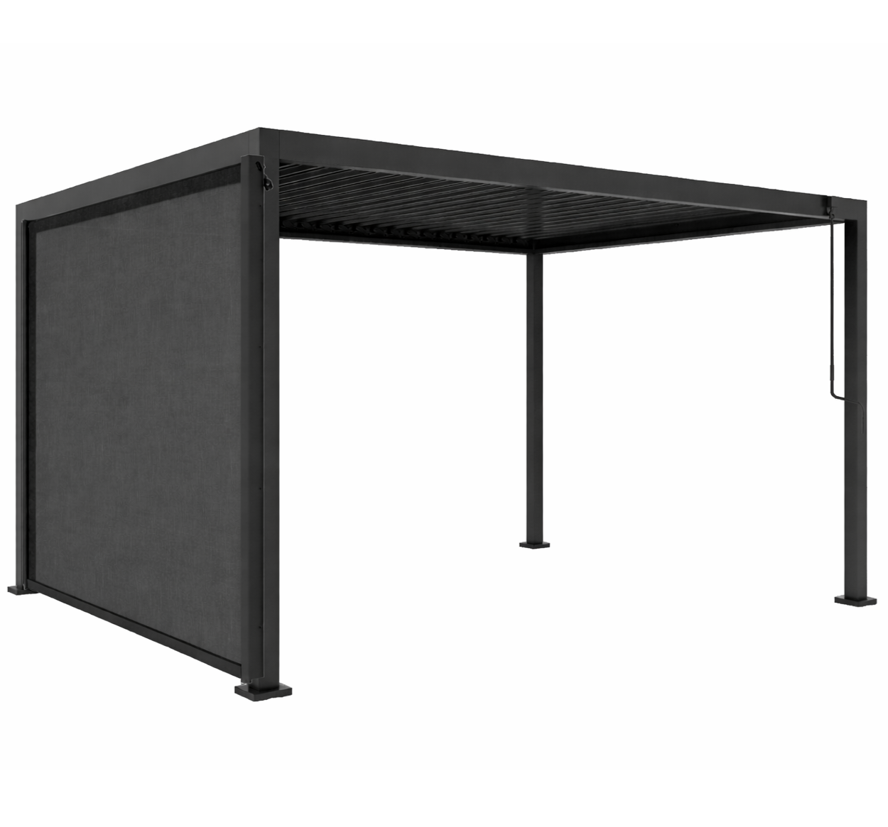 Dołączona do zestawu roleta boczna 3 m zwiększa funkcjonalność pergoli, ogranicza boczne nasłonecznienie oraz poprawia komfort korzystania z tarasu. To praktyczne uzupełnienie, które pomaga stworzyć bardziej osłoniętą i kameralną przestrzeń wypoczynkową.