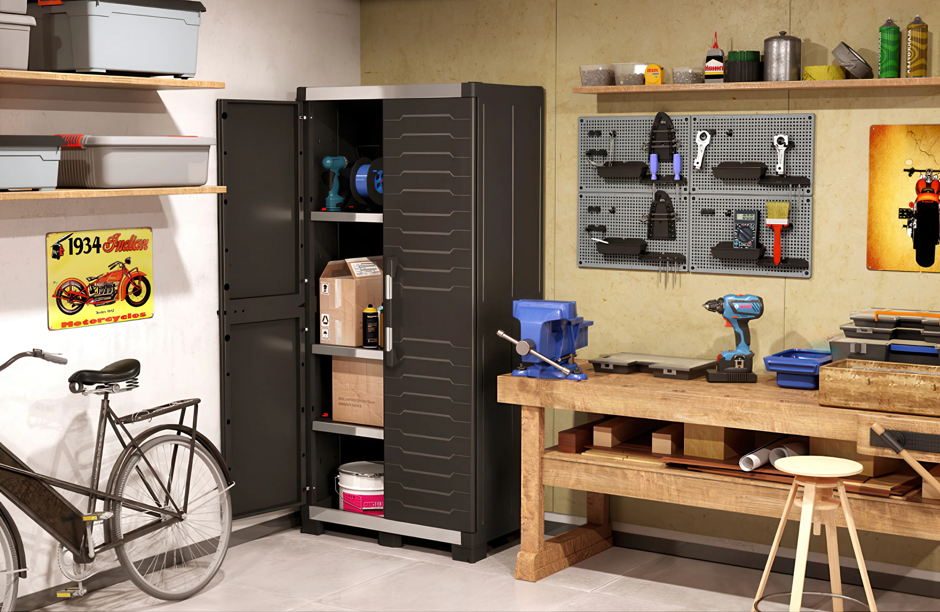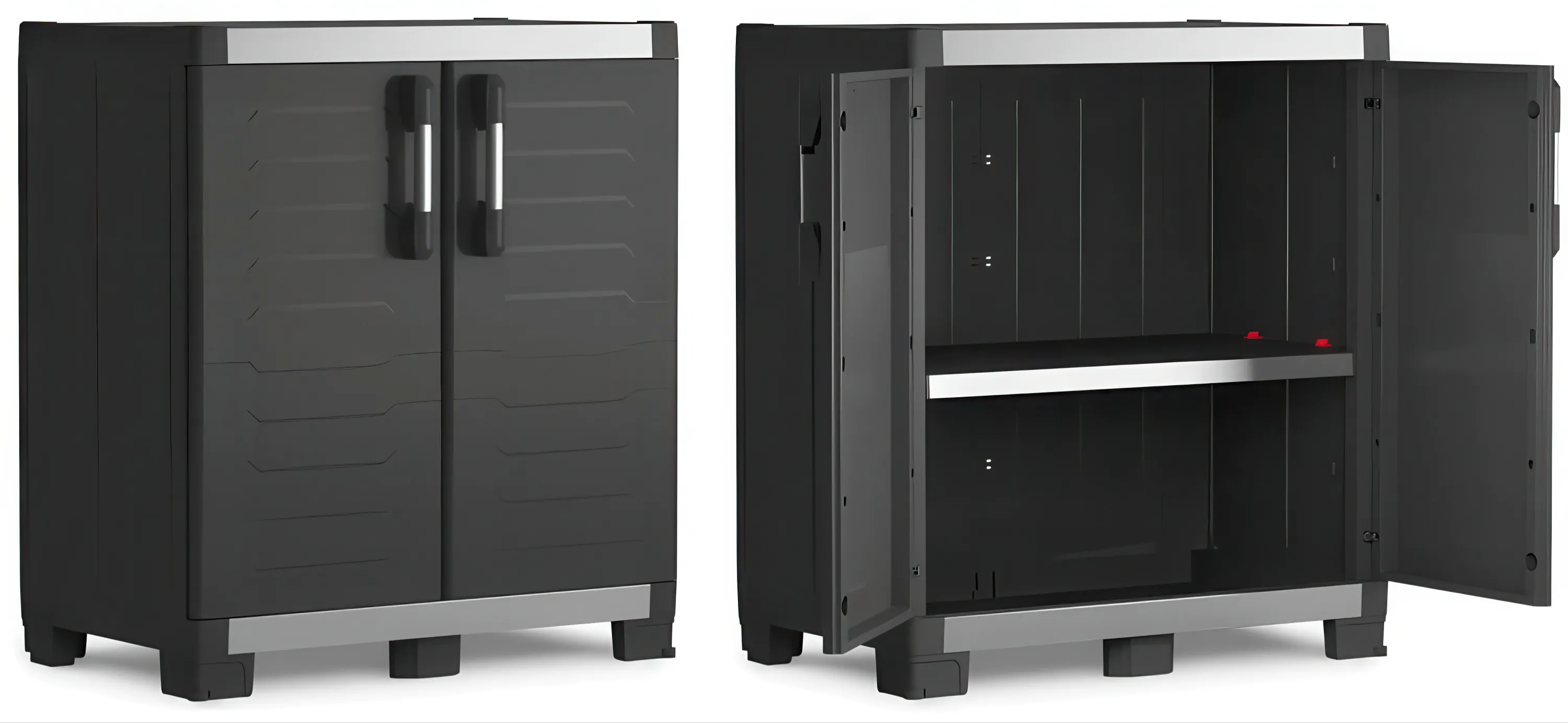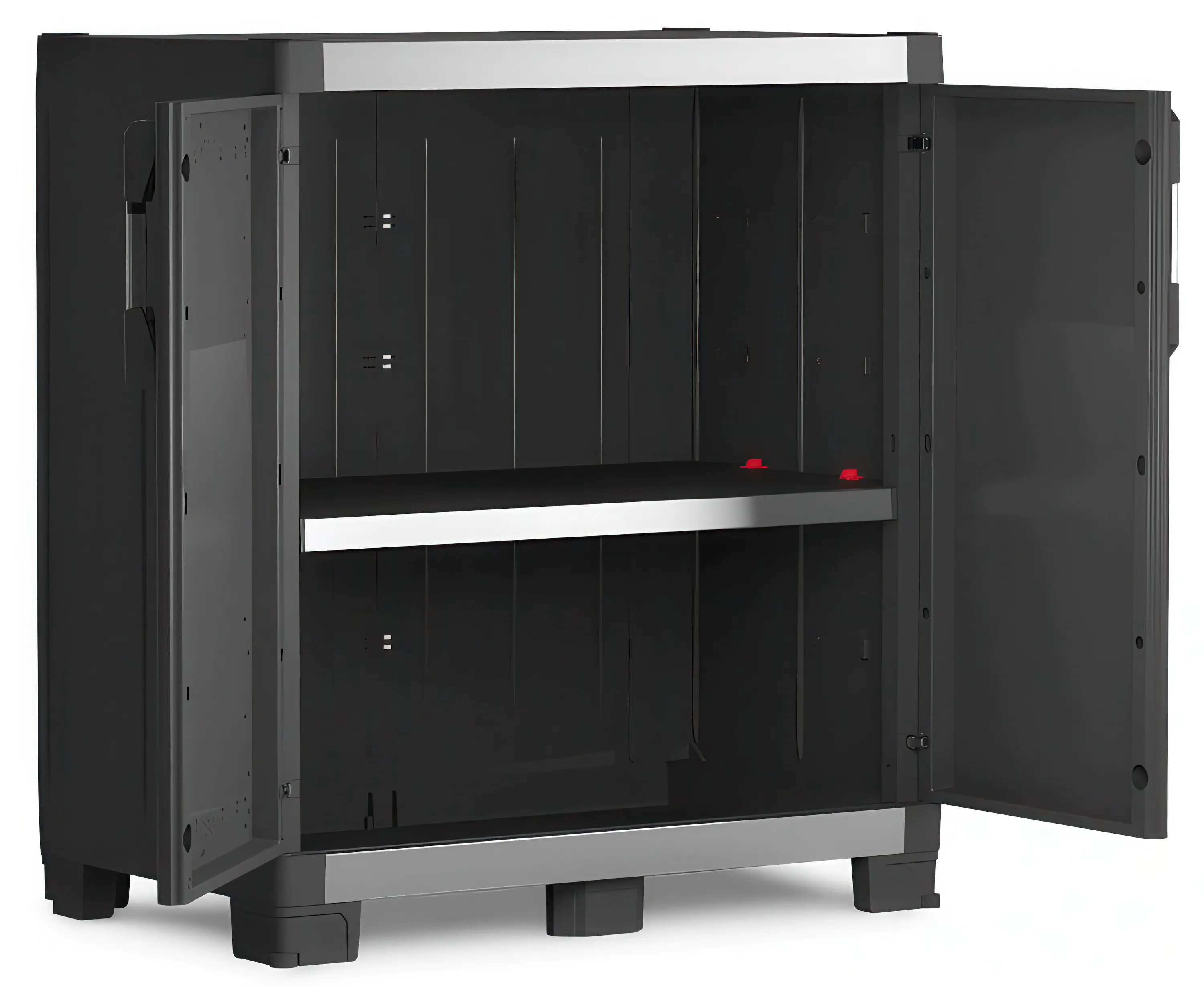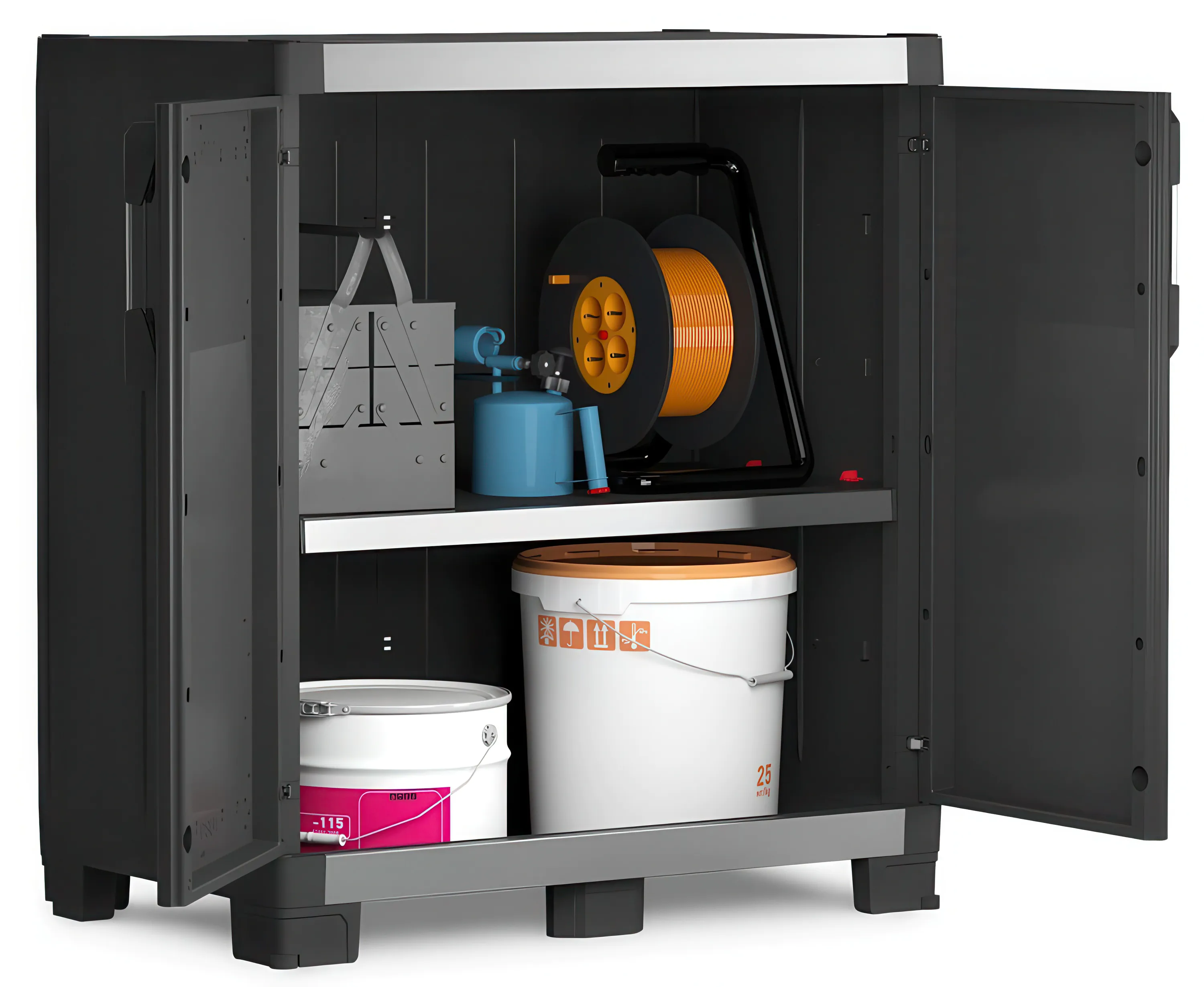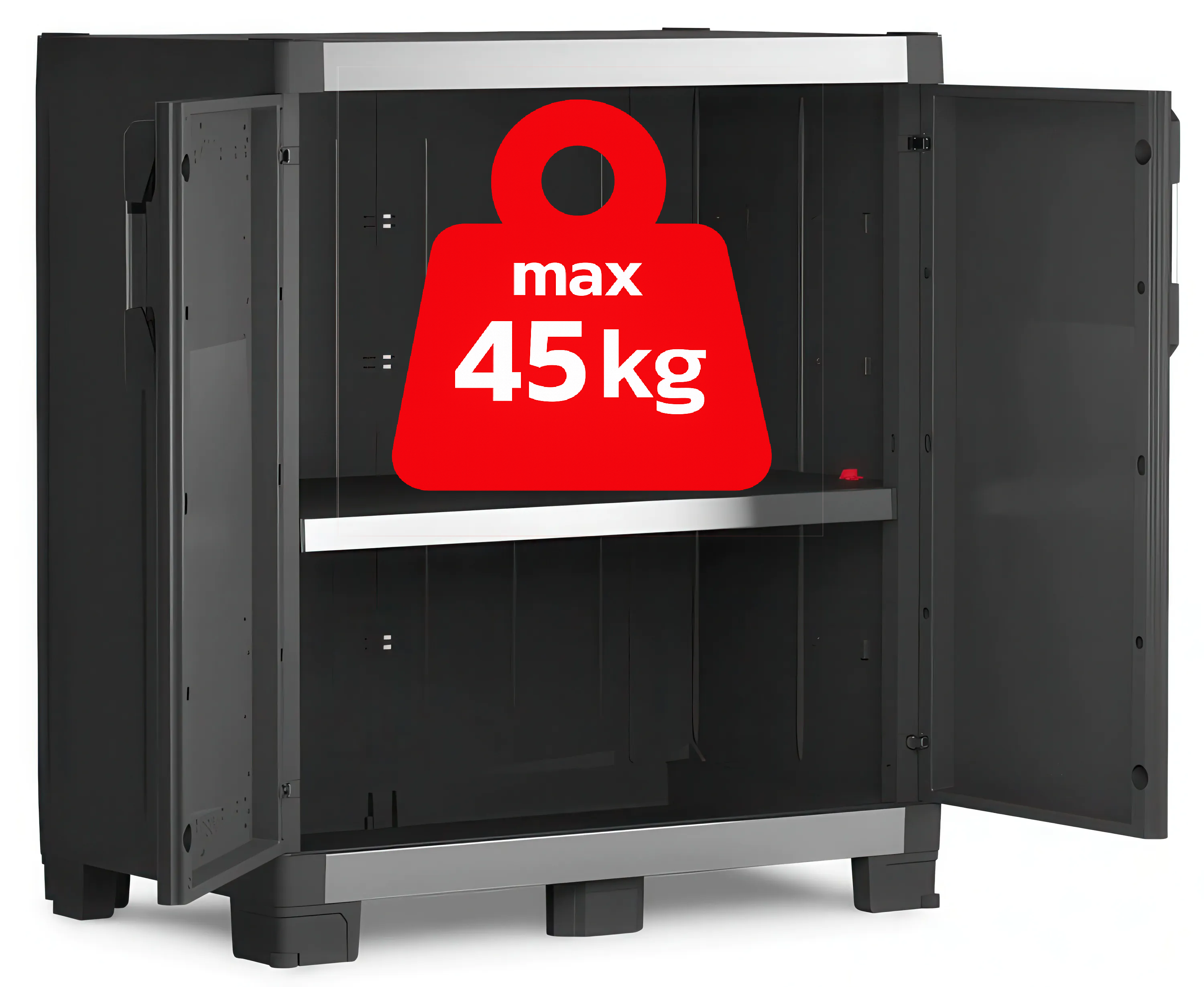 Szafka została zaprojektowana z myślą o przechowywaniu ciężkich przedmiotów – każda półka wytrzymuje obciążenie aż 45 kg. Dzięki temu XL GARAGE Low doskonale nadaje się do składowania elektronarzędzi, skrzynek narzędziowych, kompresorów czy maszyn warsztatowych.