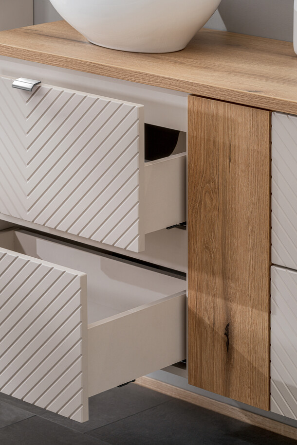 Szafka pod umywalkę 60 cm z dwiema szufladami z kolekcji Viva Cashmere to propozycja dla tych, którzy cenią sobie wyjątkowy design oraz subtelność detali. Głębia kaszmiru i trójwymiarowe, frezowane fronty w kształcie jodełki tworzą intrygujący akcent we wnętrzu, nadając przestrzeni charakteru i elegancji. Mebel wyposażony jest w uchwyty w trzech kolorach - złoty połysk, chrom połysk oraz czarny mat – dając możliwość indywidualizacji wyglądu i dostosowania do dowolnej aranżacji wnętrza.