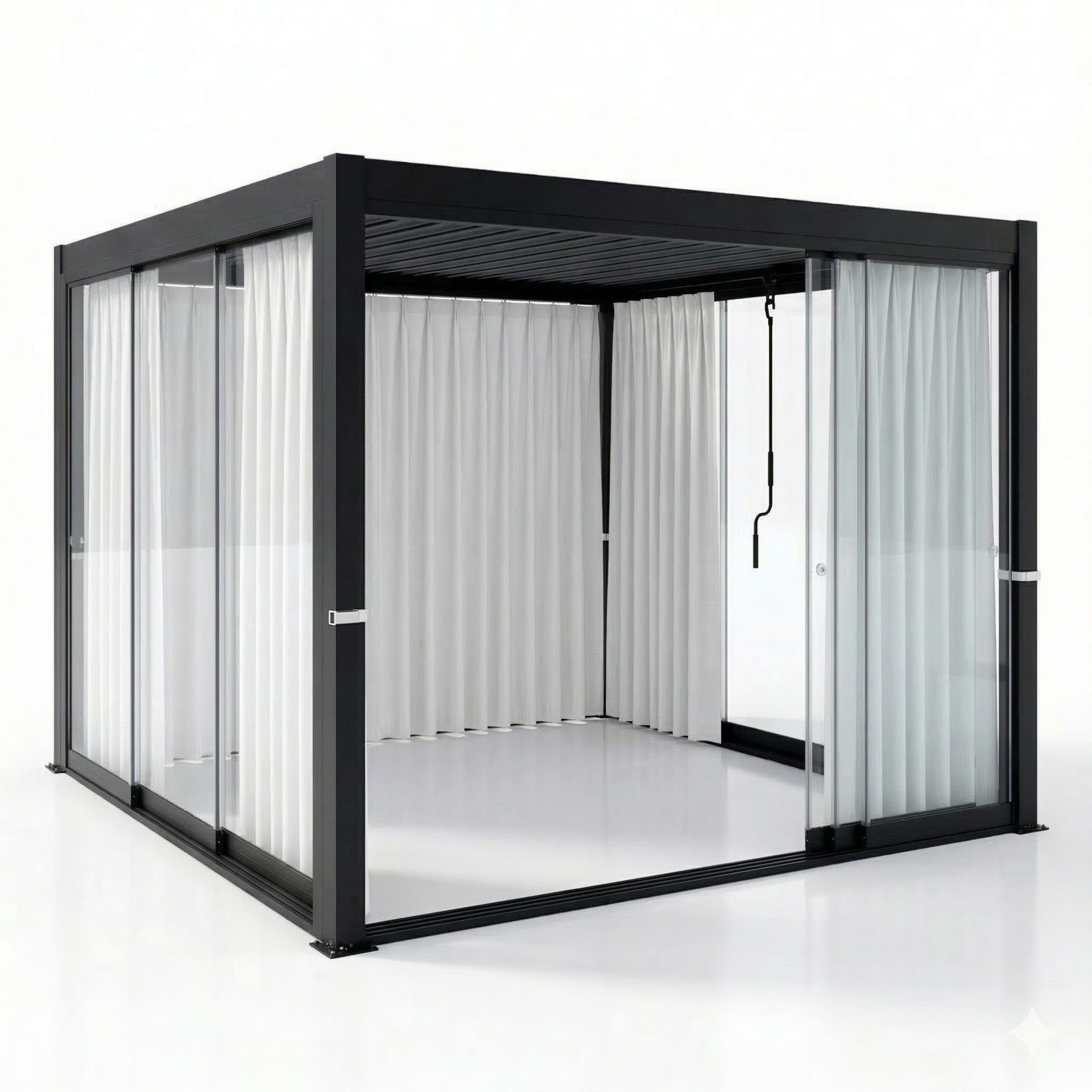 System został zaprojektowany specjalnie jako dodatek do drzwi szklanych pergoli NORDVIC Skyline – zarówno w wersji bezramkowej, jak i z aluminiową ramą. Aluminiowe prowadnice i profile montażowe zapewniają stabilne działanie systemu oraz estetyczne dopasowanie do konstrukcji pergoli.