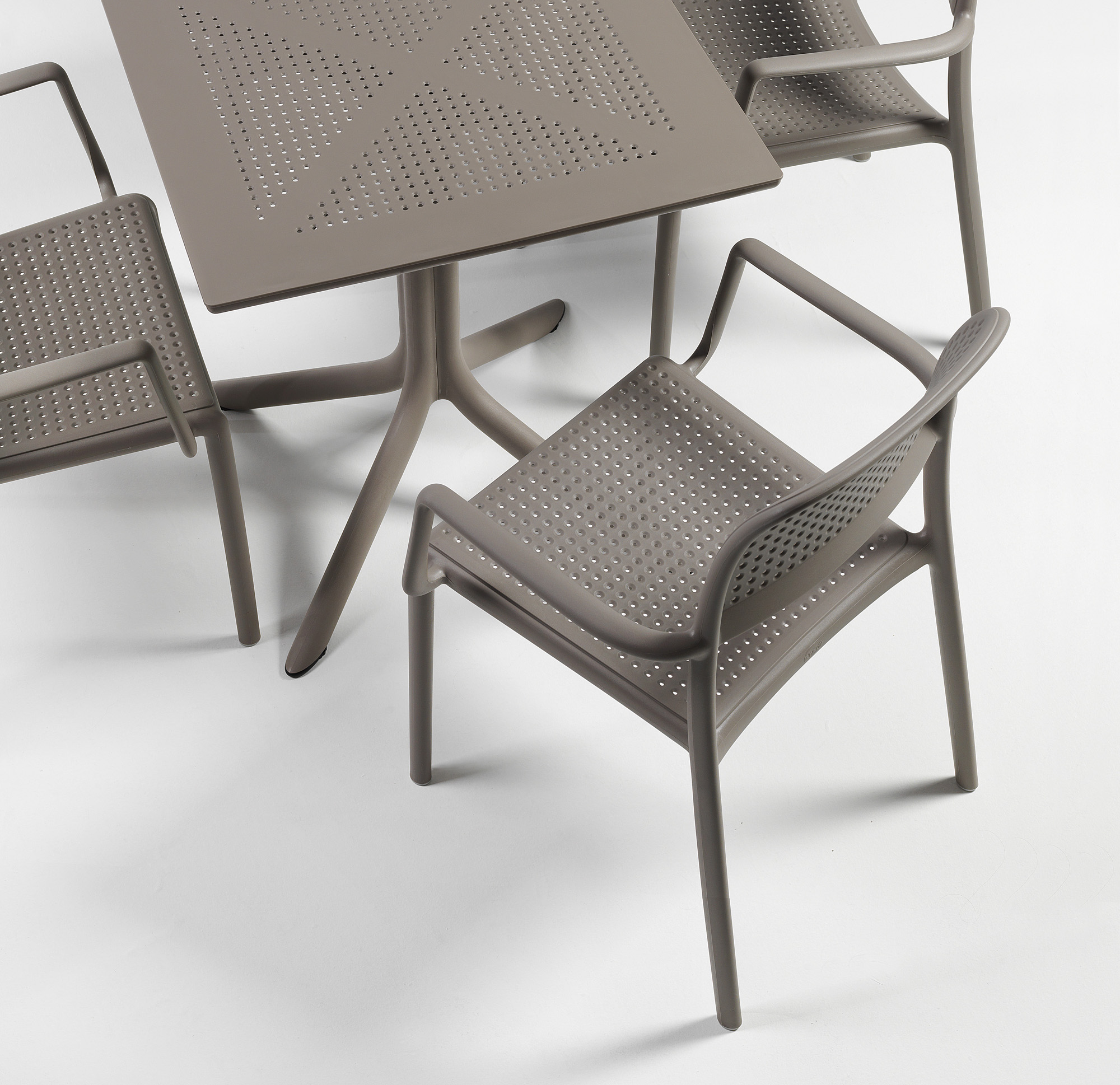 Ten zestaw to nowoczesne i funkcjonalne rozwiązanie do ogrodu, na taras lub większy balkon. Kwadratowy stolik Clip 80 cm w połączeniu z czterema krzesłami Trill z podłokietnikami tworzy komfortową przestrzeń do codziennego wypoczynku i spotkań przy kawie. Elegancki kolor Anthracite (antracyt), minimalistyczna forma oraz odporne na warunki atmosferyczne materiały sprawiają, że komplet doskonale sprawdzi się zarówno w przestrzeniach prywatnych, jak i komercyjnych.