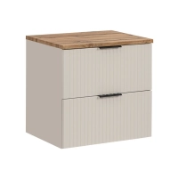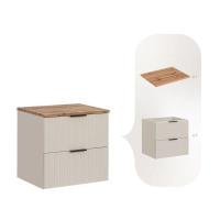 Zestaw składa się z dwóch elementów: wiszącej szafki pod umywalkę oraz blatu łazienkowego. Szafka zapewnia praktyczne miejsce do przechowywania kosmetyków i akcesoriów, a blat umożliwia montaż umywalki nablatowej dopasowanej do indywidualnych preferencji.